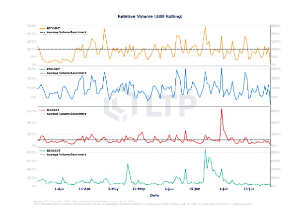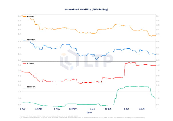 Na semana passada, a volatilidade anualizada do Bitcoin, Ethereum e Bitcoin Cash apresentou uma tendência de queda. A volatilidade do Bitcoin atingiu uma baixa trimestral, pois foi contida na consolidação ao longo de julho. No entanto, o Litecoin viu um aumento na volatilidade, o que pode ser atribuído ao seu próximo evento de redução pela metade no início de agosto. Essa redução antecipada na oferta provavelmente contribuiu para o aumento das flutuações de preço do Litecoin.