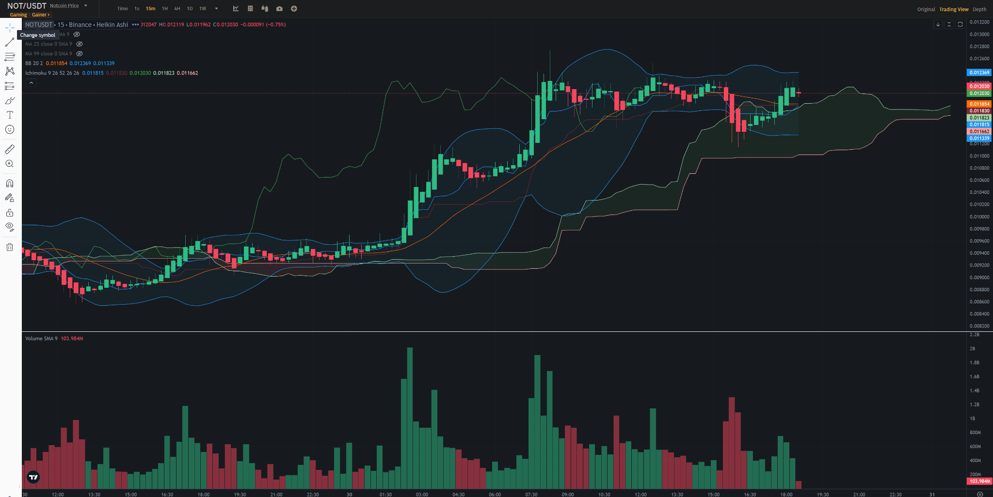 Ponto de entrada: insira uma posição longa se o preço permanecer acima da nuvem Ichimoku e MA 9 após uma breve consolidação ou recuo.