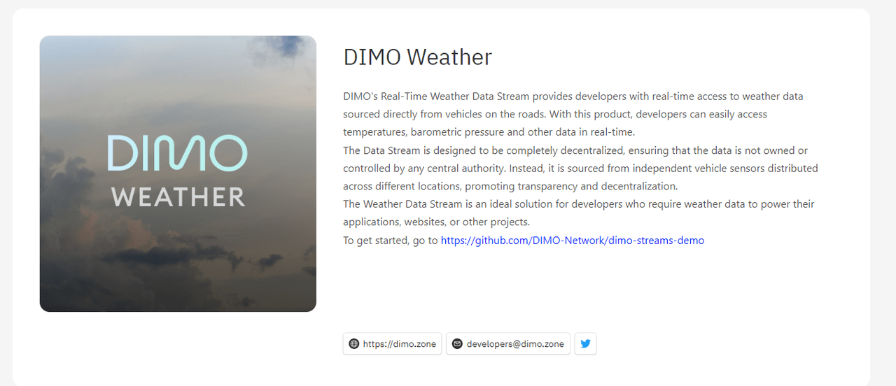 Em aplicações do mundo real, a Streamr colaborou com outro projeto de hardware de veículo Web3, o DIMO, para coletar dados como temperatura e pressão do ar por meio de sensores de hardware DIMO instalados em veículos. Esses dados são então transmitidos como fluxos de dados meteorológicos para organizações que precisam deles.