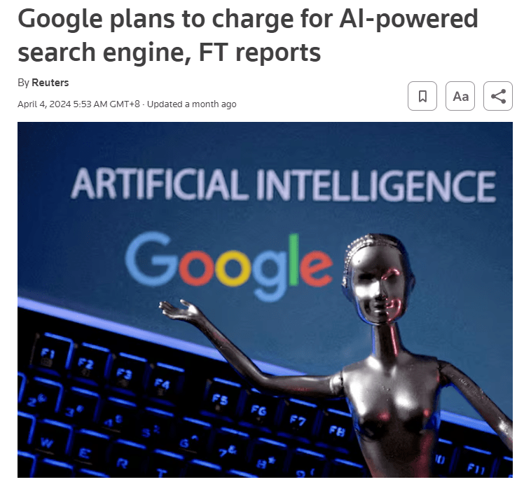 Além disso, o Google, como o maior mecanismo de busca do mundo, está considerando cobrar taxas por seus serviços de busca — não para o público em geral, mas para empresas de IA.