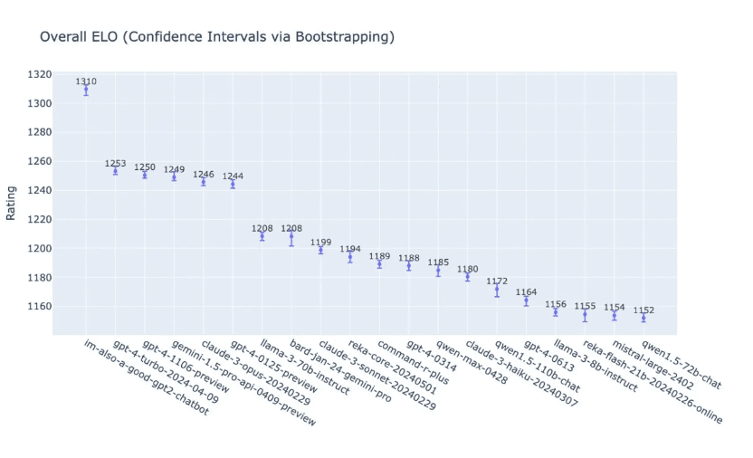 Nas primeiras horas de 14 de maio, a OpenAI apresentou o desempenho mais recente do GPT-4o e de outras 19 versões de grandes modelos de linguagem em pontuações de tarefas abrangentes em seu Spring New Product Launch. De acordo com a tabela, o GPT-4o pontuou 1310, o que visualmente parece significativamente mais alto do que os outros. No entanto, em termos de pontuação total, é apenas 4,5% maior do que o segundo colocado GPT-4 turbo, 4,9% maior do que o Gemini 1.5 Pro do Google em quarto lugar e 5,1% maior do que o Claude3 Opus da Anthropic em quinto lugar.