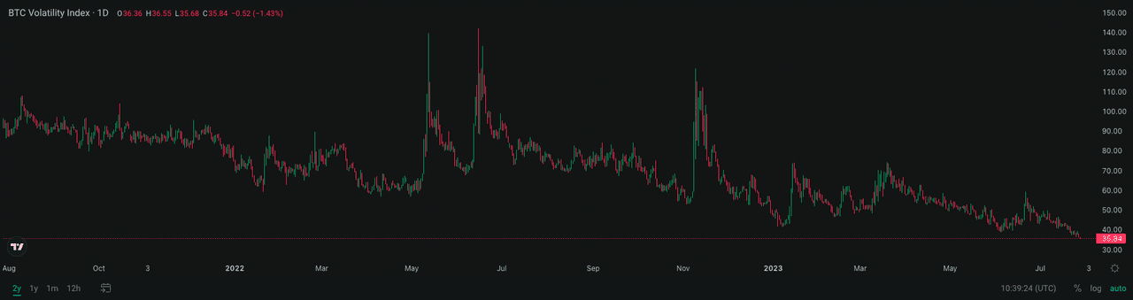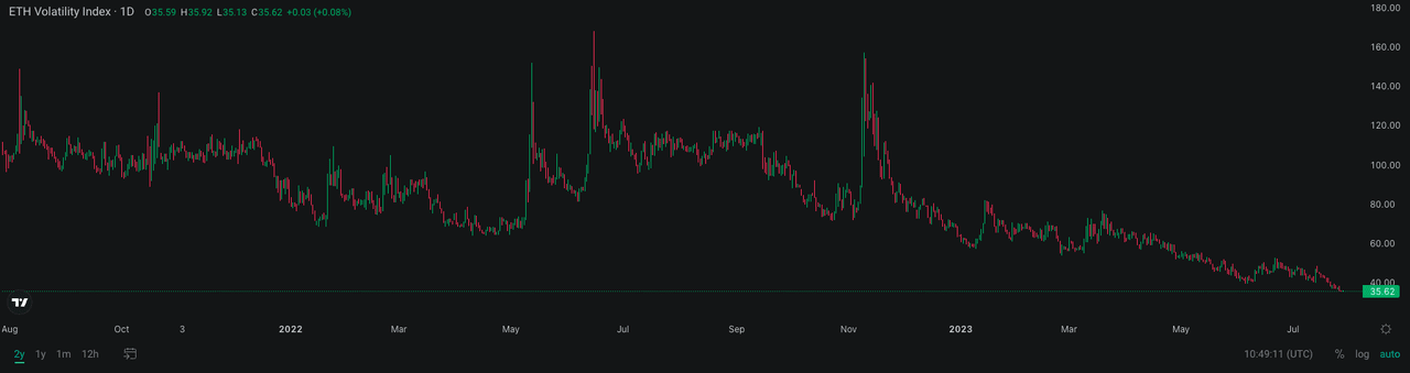 "Férias de verão" significa baixa volatilidade. O Índice de Volatilidade do BTC e do ETH (DVOL) quebrou uma nova baixa de 2 anos e, mesmo com essa expectativa de volatilidade recorde, os vendedores de opções ainda podem obter lucros, o que significa que a volatilidade realizada no mercado ainda é significativamente menor do que o esperado. Em 2021, poucos considerariam um cenário em que o movimento de preço intradiário do BTC fosse inferior a 1%. Em contraste, em meados de 2023, o movimento de preço diário de 0,1% se tornou normal no mercado de criptomoedas.