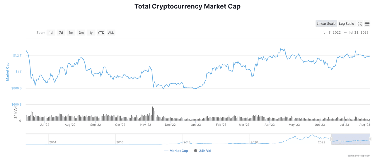 Da mesma forma, os investidores de criptomoedas se tornaram menos sensíveis às taxas de juros devido ao sentimento generalizado de esperar para ver e à baixa volatilidade. Mesmo que Powell e Lagarde aumentem as taxas de juros 1-2 vezes, será apenas "um passo adiante no Monte Everest" - a situação de liquidez não piorará. Muitos "dinheiros inteligentes" já foram embora, mas a liquidez em queda não deixará o mercado de criptomoedas rapidamente, fornecendo o suporte de preço necessário para as criptomoedas. No entanto, a liquidez em queda geralmente é inativa: a julgar pelas mudanças no limite de mercado de criptomoedas, o limite de mercado total oscilou em torno de US$ 1,2 trilhão por mais de quatro meses e meio desde meados de março.