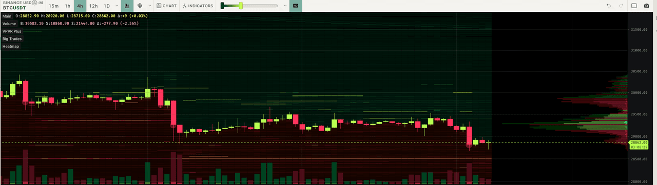Mais evidências dos dados do VPVR (Volume Profile Visible Range) dão suporte ao "efeito gama". Tomando o BTC como exemplo, perto de US$ 30.000, as ordens de venda dominam, mostradas em vermelho, enquanto perto de US$ 29.000, a parte que mostra uma cor verde clara domina as ordens de compra. No ETH, há uma distribuição semelhante de ordens de compra e venda.