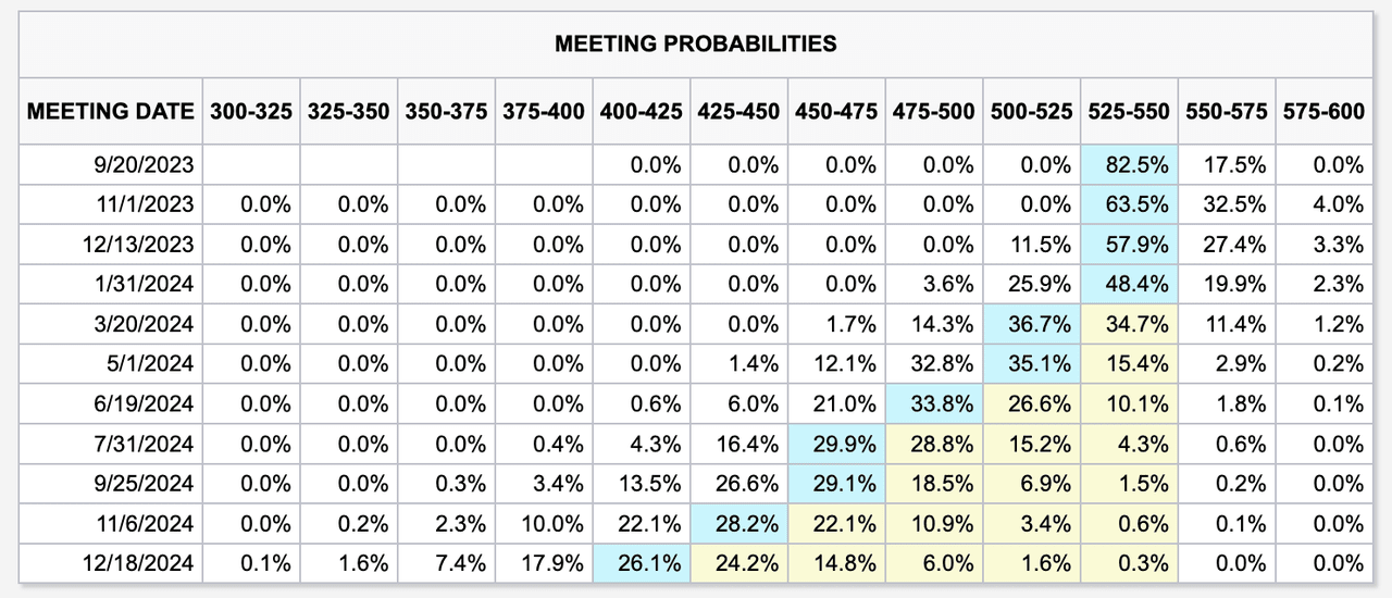 O possível caminho das mudanças na taxa do Fed, a partir de 2 de agosto de 2023. Fonte: CME Group