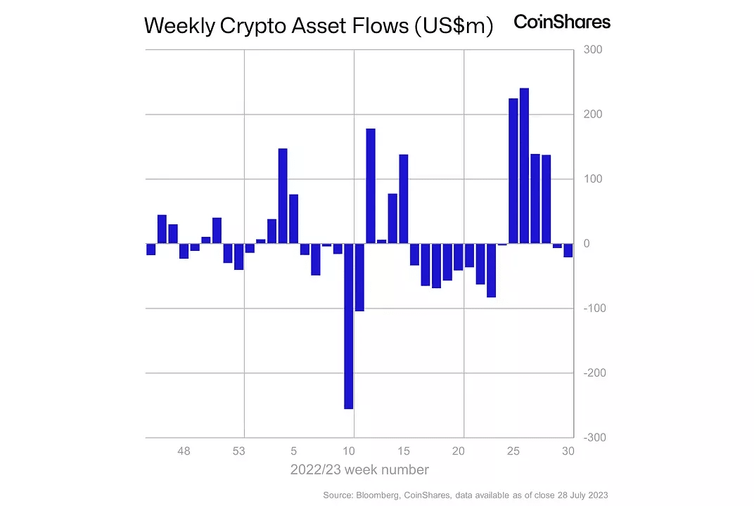 Entradas/saídas líquidas semanais de fundos de criptomoedas no ano passado, fonte: CoinShares