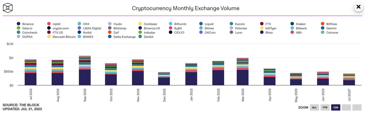 Mudanças no volume spot mensal no mercado de criptomoedas. Fonte: The Block