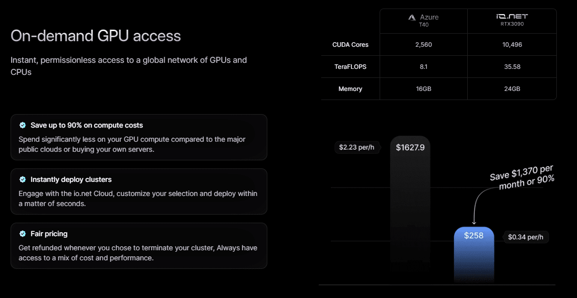 Ao combinar GPUs de fontes subutilizadas, como data centers independentes e projetos criptográficos, a io.net cria um ambiente de fornecimento de poder de computação totalmente novo, ajudando os engenheiros de máquina que aprendem a acessar facilmente os recursos da GPU no mercado descentralizado.
