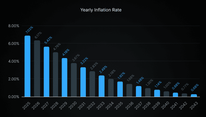 Enquanto isso, 300 milhões de tokens IO usados para recompensas serão distribuídos de hora em hora durante 20 anos para fornecedores de GPU e stakers. Este modelo de bônus segue a regra de inflação decrescente, começando em 8% no primeiro ano e diminuindo 1,02% ao mês (equivalente a cerca de 12% ao ano) até atingir o limite de 800 milhões de IO.