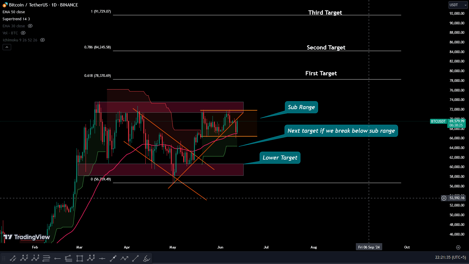 Cenário de alta: Para os touros, a região em torno de US$ 72.000 é a área mais crítica, representando a faixa alta. O $BTC foi rejeitado deste nível cinco vezes nos últimos três meses. Para uma perspectiva otimista, o Bitcoin precisa alcançar um rompimento claro da faixa e um fechamento diário acima de US$ 72.000. No caso de um rompimento bem-sucedido, o Bitcoin poderá subir para a região de US$ 78.000 a US$ 84.000. Veja o gráfico abaixo, onde são mencionadas as metas para ambos os cenários.