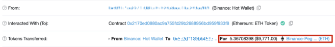 A imagem acima mostra uma transação em que um usuário tentou sacar tokens ERC-20 e optou pela Cadeia BSC na seção de rede de sua carteira Binance. Como resultado disso, seus tokens foram bloqueados como Binance-Peg Ethereum com o mesmo endereço de carteira mostrado na imagem.
