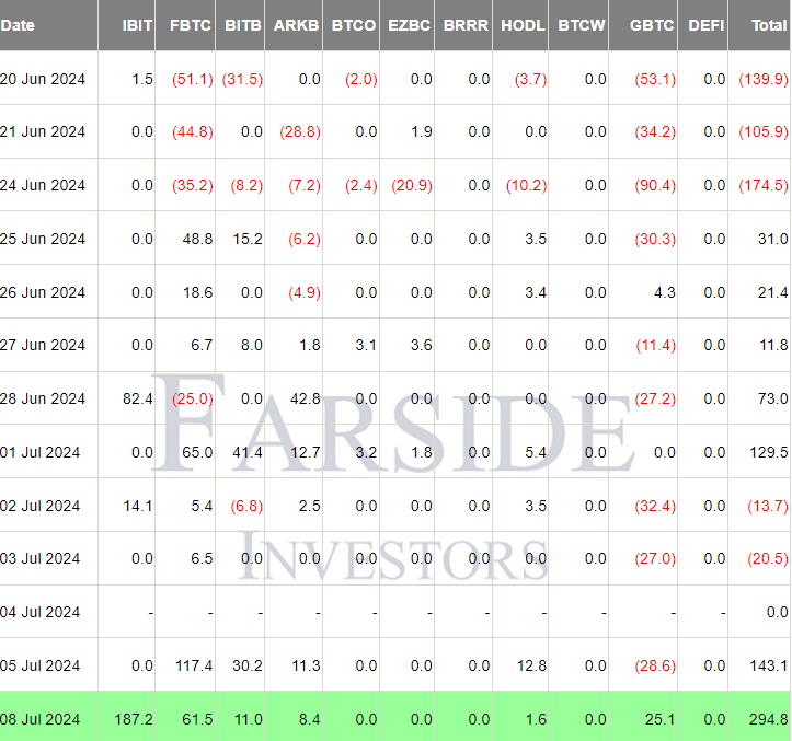 Bitcoin ETFs saw a net inflow of $295 million on July 8th, the highest in 21 days