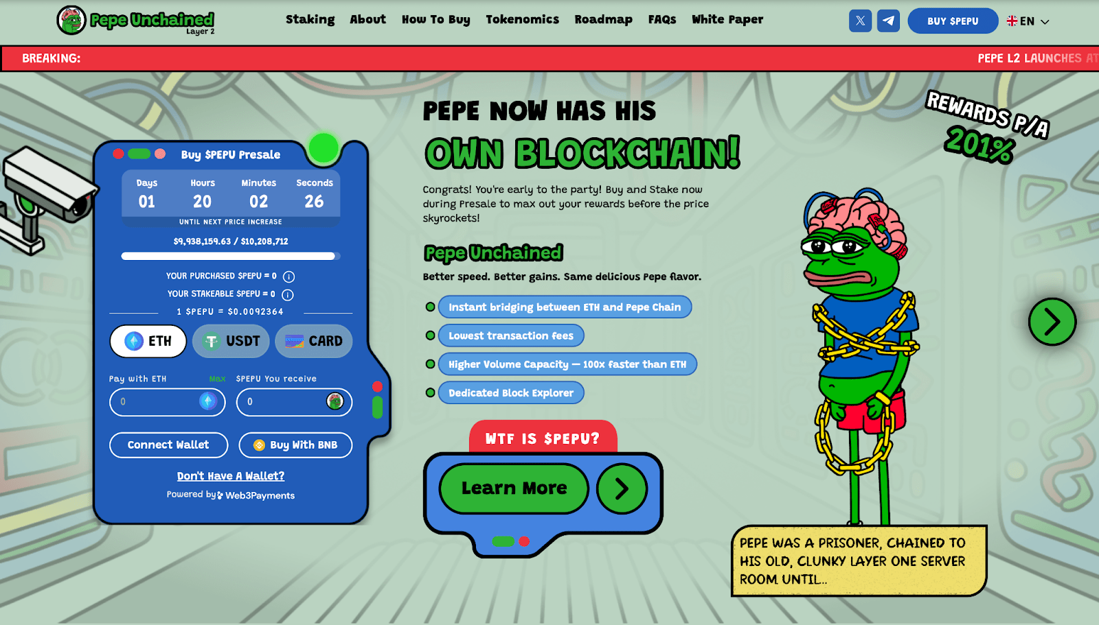 Recompensele sale de miză sunt, de asemenea, mult mai bune. În timp ce participanții ETH obțin până la 7% APY, stakingul Pepe Unchained oferă peste 200% APY. Aceasta este o creștere de aproape 30 de ori.