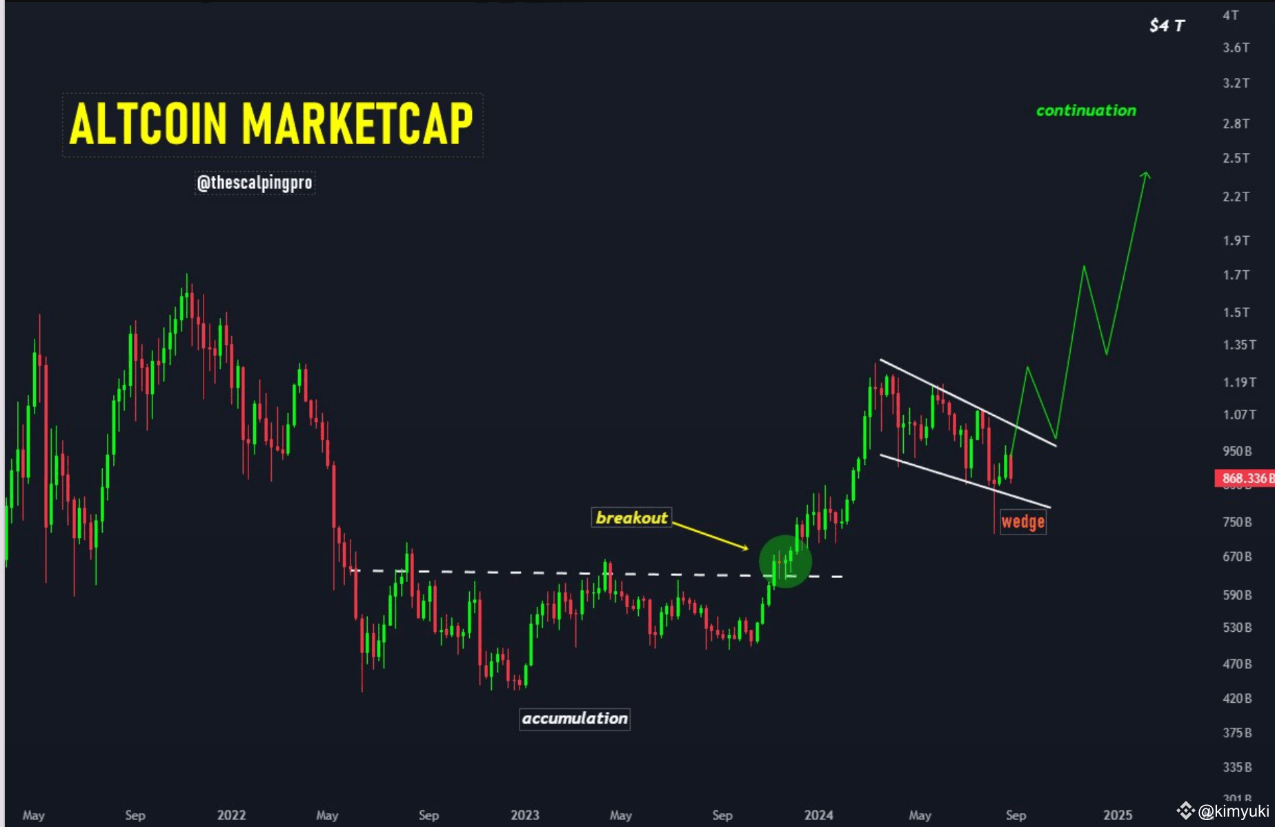 Trong khi đó, trader ẩn danh Mags chỉ ra rằng “vốn hóa thị trường altcoin đang hình thành mô hình nêm giảm, một mô hình tiếp tục xu hướng tăng giá.”