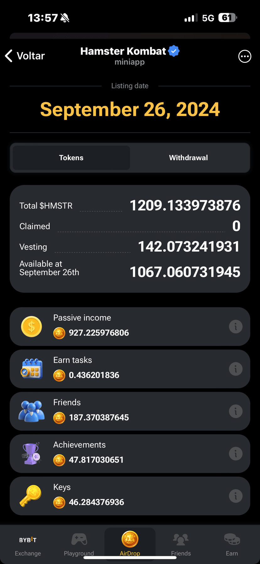 Spre surprinderea multora, la sfârșitul primului său sezon, Hamster Kombat a distribuit airdrop-ul său, cu o valoare mult mai mică decât cea așteptată de marea majoritate a utilizatorilor, fiind mult mai mică decât tokenul Dogs care, într-un timp scurt, a plătit un airdrop satisfăcător bazei sale de utilizatori.