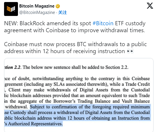 Pe de altă parte, Coinbase a provocat recent îngrijorarea comunității cu privire la vânzarea „Paper BTC” (Paper BTC, care se referă la produse financiare sintetice fără suport real Bitcoin) către emitenții ETF. În acest sens, potrivit unui tweet de la Bitcoin Magazine, BlackRock, unul dintre emitenții de ETF-uri Bitcoin spot din Statele Unite, a modificat acordul de custodie al ETF-urilor spot Bitcoin cu Coinbase, solicitând scurtarea timpului de retragere a Bitcoin. Conform acordului, Coinbase trebuie să retragă Bitcoin din contul escrow la o adresă publică în termen de 12 ore de la primirea instrucțiunii.