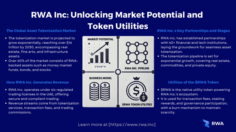Potențialul pieței: se estimează că piața de tokenizare va crește exponențial, sectorul de tokenizare a activelor urmând să atingă o scară globală semnificativă. Transformând active precum imobiliare și mărfuri în token-uri digitale bazate pe blockchain, RWA Inc. deschide noi oportunități de investiții și crește lichiditatea în toate sectoarele.