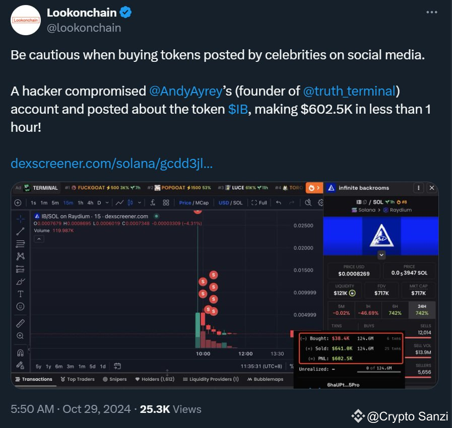 Hacker hacked Andy Ayrey's Twitter (creator of the #AI bot Terminal of Truths) and posted about a fake token launch called $IB. The result? A cool $602K profit for the hacker...in just one hour! 💸