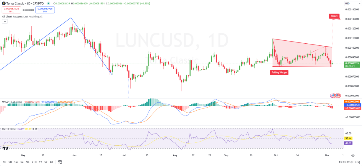 Deși impactul imediat asupra prețului a fost limitat, indicatorii tehnici sugerează posibilitatea unei tendințe ascendente viitoare. Analiștii au identificat un model de „wedge descendent” pe graficul de preț al LUNC, o formare care semnalează de obicei o inversare bullish. Acest model se formează atunci când prețurile oscilează între linii de trend convergente, adesea sugerând o potențială ruptură.