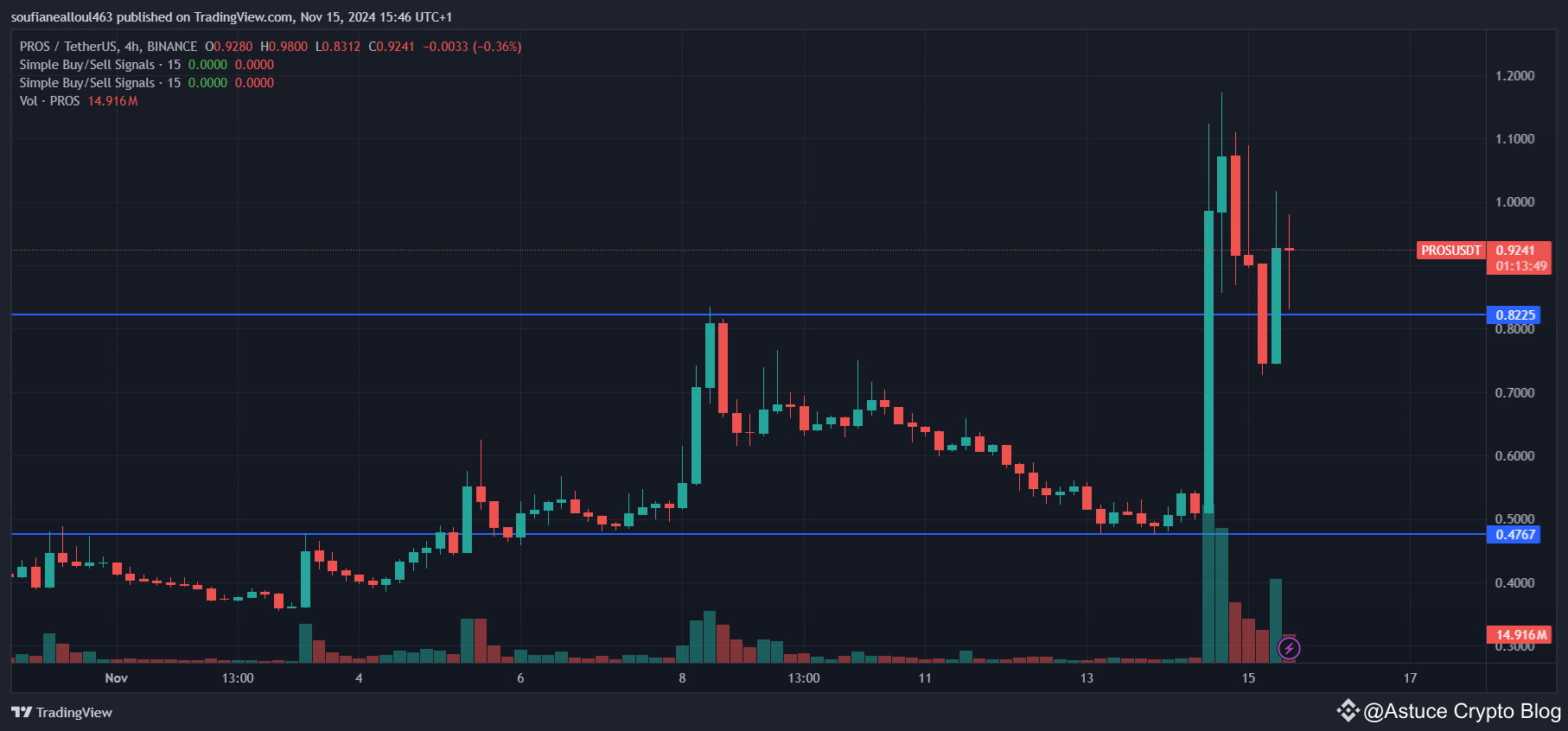Actuellement, le token $PROS de Prosper (PROS/USDT) montre des mouvements intéressants sur le marché. Au cours des dernières semaines, on a observé une hausse significative qui a porté le prix jusqu'à 1,20 USD avant une correction autour de 0,90 USD, comme visible sur le graphique Binance. Examinons les indicateurs techniques pour mieux comprendre la tendance actuelle et les prévisions.