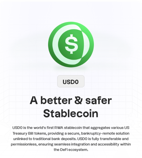 Proiectat pentru plăți, contraparte de tranzacționare și utilizarea garanțiilor. USD0 este o monedă stabilă susținută în totalitate 1:1 de active din lumea reală (RWA) precum bonurile de trezorerie ale SUA. Oferă utilizatorilor un activ stabil, sigur, independent de sistemele bancare tradiționale, complet transferabil și accesibil în cadrul ecosistemului DeFi.