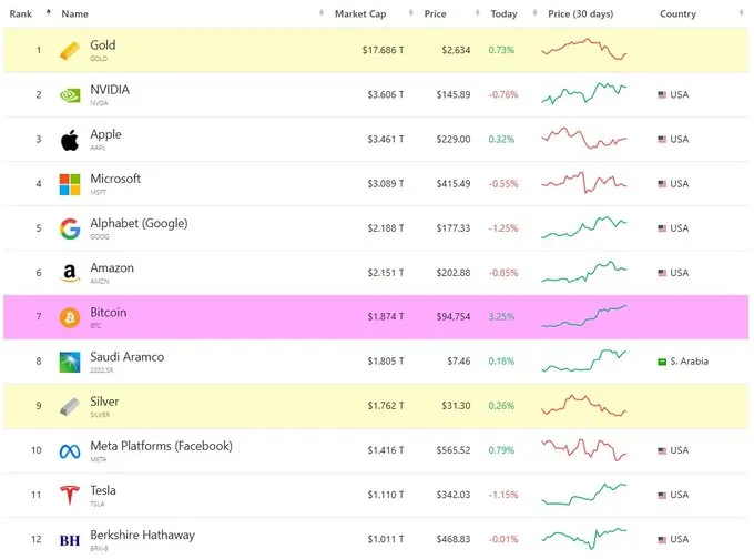 Bitcoin se marchează ca unul dintre cele mai puternice active în ceea ce privește creșterea, deoarece acest token a intrat în top 10 active după capitalizare. Bitcoin a depășit giganți precum Facebook și Saudi Aramco, precum și active tradiționale precum argintul, având o capitalizare de aproape 2 trilioane de dolari și ocupând locul 7. În plus, comparativ cu alte active, acest token a avut cea mai mare creștere, ceea ce sugerează că Bitcoin ar putea fi abia la începutul unei expansiuni.