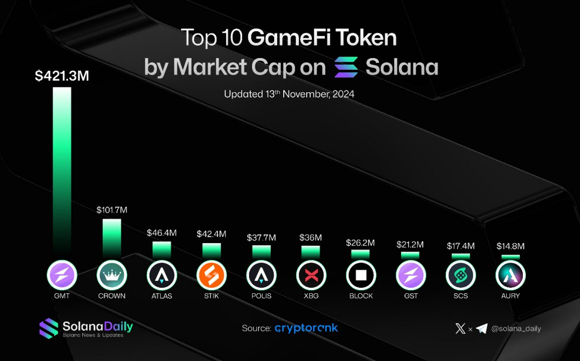 Conform celor mai recente date publicate de Solana Daily, GMT se află pe primul loc în clasamentul capitalizării de piață a tokenurilor GameFi din Solana, cu o capitalizare de 421,3 milioane de dolari, având un avans semnificativ față de CROWN (110,7 milioane de dolari) pe locul doi. Dacă nu menționăm Stepn, pare că mulți oameni au uitat treptat de tokenul de vârf GMT din domeniul GameFi.