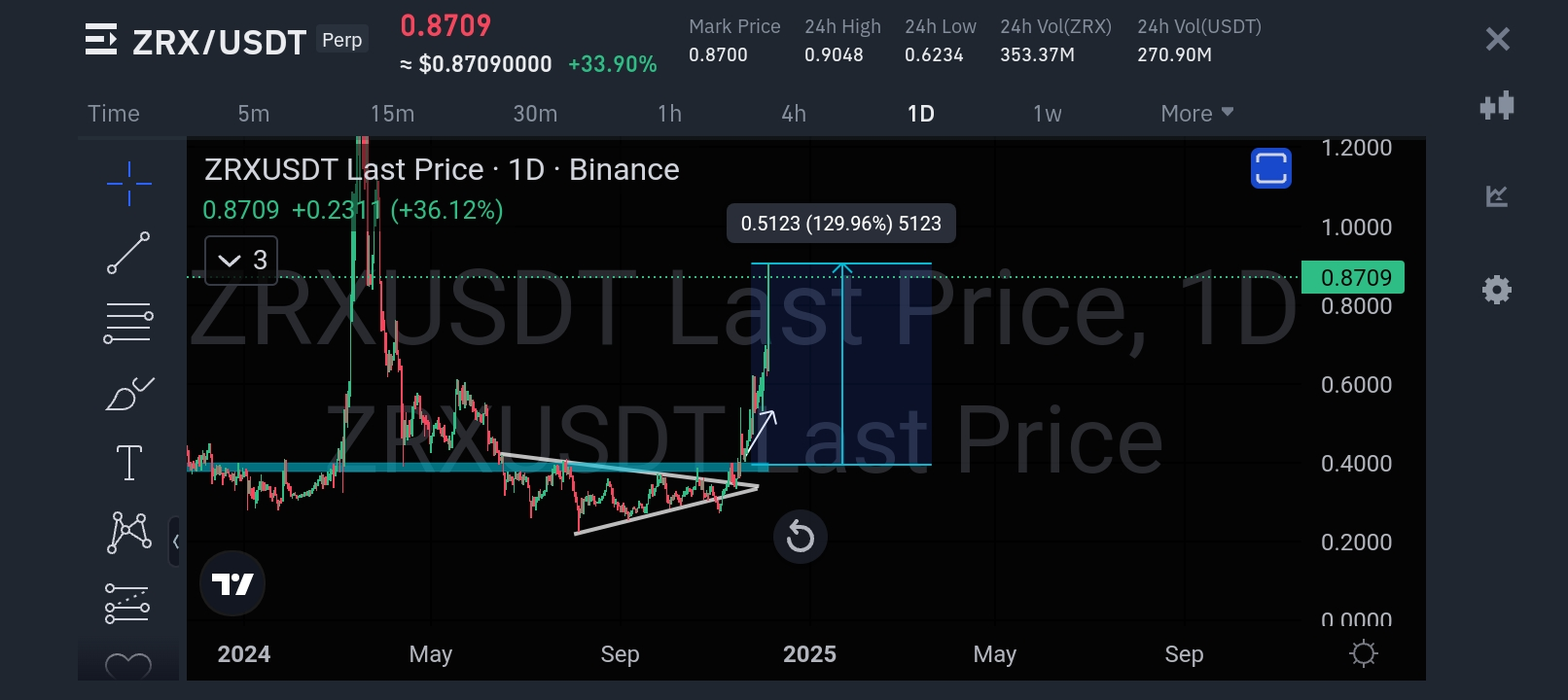 După cum era de așteptat, ruptura a avut loc! ZRX/USDT a crescut de la $0.40 la $0.87, oferind un câștig incredibil de 129.96%. Aceasta este puterea de a înțelege și a avea încredere în analiza tehnică.