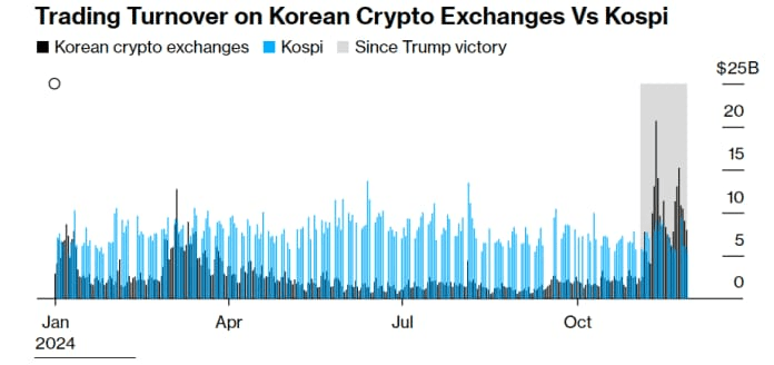 Victoria lui Donald Trump în Statele Unite a stârnit o creștere a acestei tendințe. Între 5 și 28 noiembrie, bursele de criptomonede au înregistrat un volum de tranzacționare de 9,4 miliarde de dolari, în timp ce pe Kospi a fost de 7,7 miliarde de dolari, conform datelor compilate de Bloomberg.