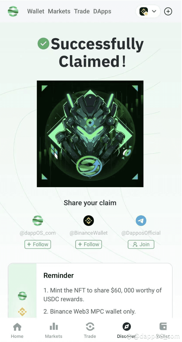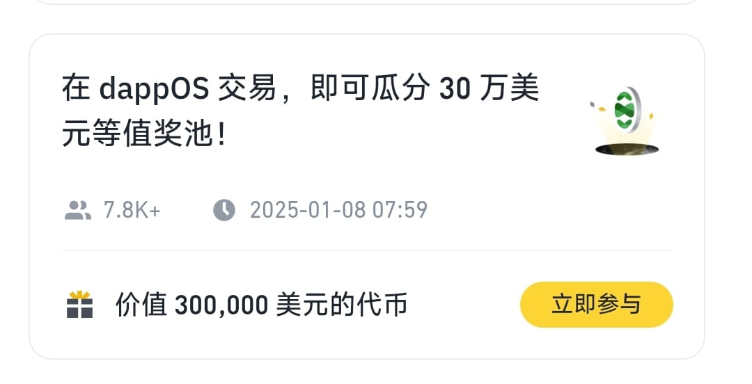 Frate, activitatea de airdrop dappOS pe portofelul Binance, acum sunt doar 7800 de oameni care participă, suma totală a airdrop-ului este de până la 300.000 de dolari! Așadar, fiecare primește 36 de dolari! Așa că trebuie să ne implicăm, iată un ghid despre cum să participi la activitate: