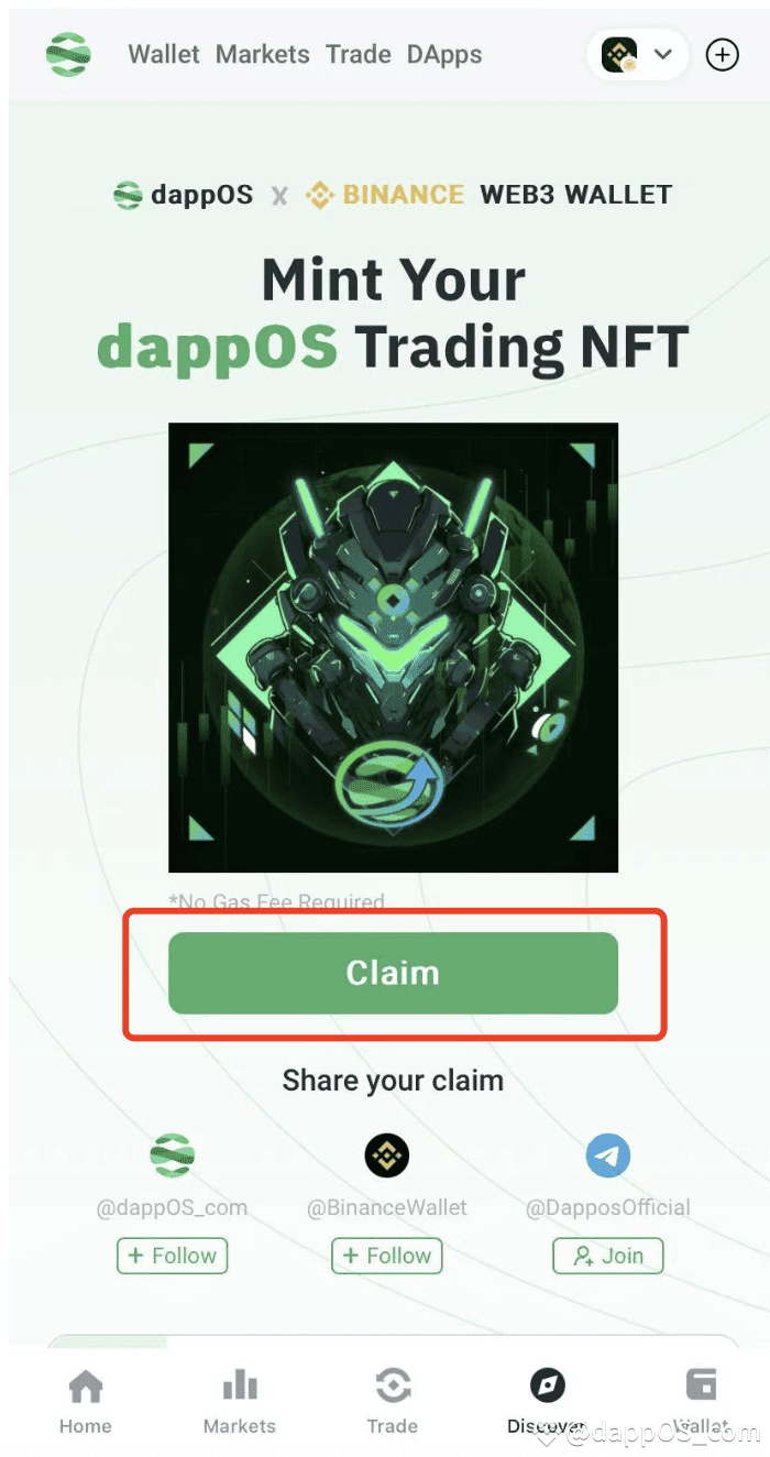 Accesează portofelul web3 de la Binance, găsește activitatea de airdrop dappOS: