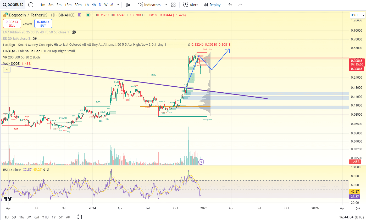 Graficul DOGE arată o erupție deasupra liniei de tendință descendentă, confirmând impulsul optimist. O retragere din zona maximă slabă sugerează consolidare, cu un suport puternic aproape de 0,26 USD. RSI indică niveluri de supravânzare, semnalând potențialul de inversare ascendentă. O spargere peste 0,32 USD ar putea declanșa o continuare optimistă spre 0,40 USD. Perspectiva pe termen lung rămâne pozitivă.