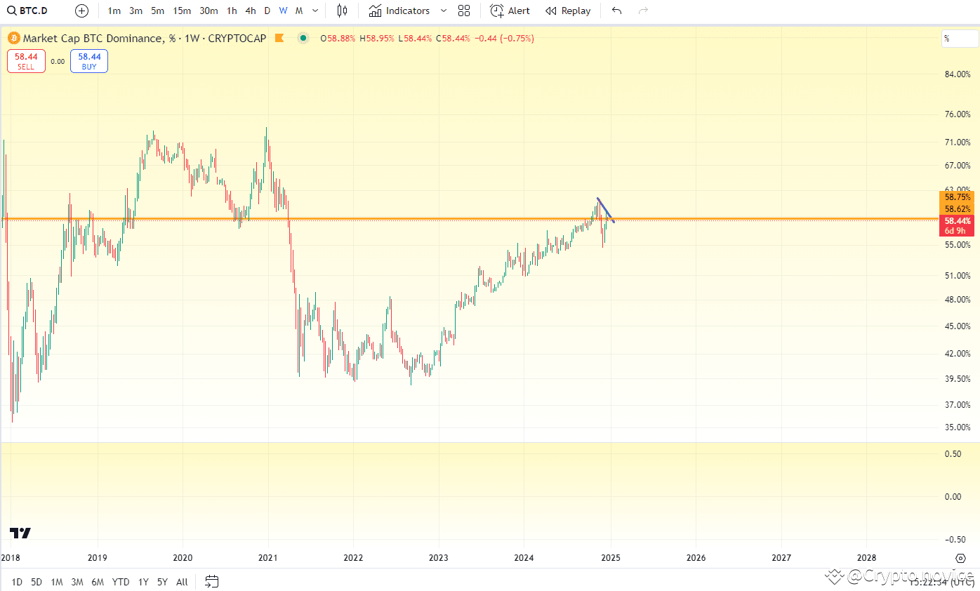 Graficul Dominanței BTC arată o respingere de la un nivel cheie de rezistență de 58.8%, formând o potențială divergență bearish. Un triunghi descendent sugerează o continuare bearish. Totuși, dominanța pe termen lung rămâne aproape de un maxim de mai mulți ani, indicând putere. Indicatorii de moment sugerează consolidare sau o mică retragere înainte ca o tendință decisivă să apară.