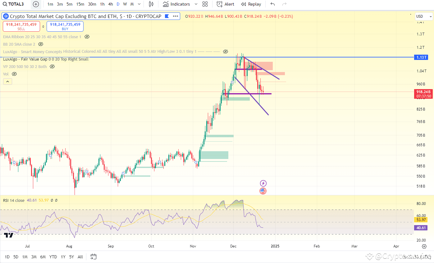 Graficul TOTAL3 arată un canal descendent, indicând o tendință bearish pe termen scurt. Respingerea prețului aproape de rezistența de $1.13T și maximele mai joase confirmă sentimentul bearish. RSI aproape de niveluri supraevaluate semnalează potențial pentru un bounce de ușurare. Momentumul bullish pe termen lung rămâne valid dacă suportul la $900B se menține, în ciuda consolidării bearish actuale.
