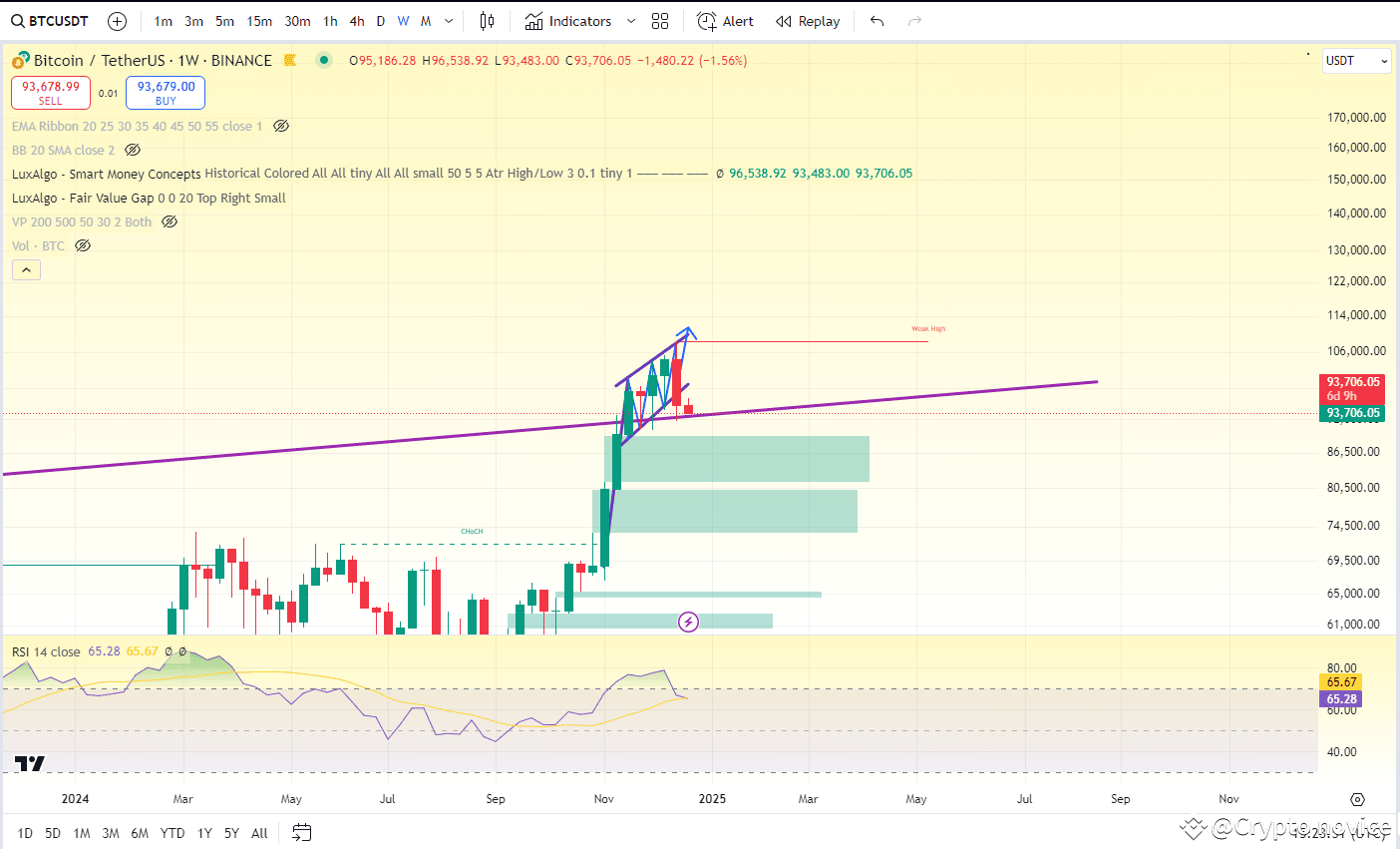 Graficul reflectă intervalul de timp săptămânal al Bitcoin cu o formare de pană în creștere,