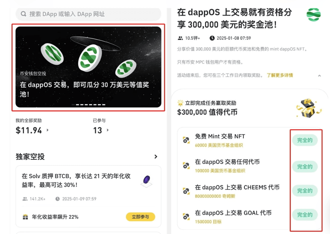 Pentru a permite unui număr mai mare de utilizatori să experimenteze funcțiile puternice ale dappOS, dappOS a colaborat cu portofelul Web3 de la Binance pentru a lansa activitatea de împărțire a token-urilor de 300.000 de dolari. Modul de participare este foarte simplu, utilizatorii trebuie doar să finalizeze o serie de sarcini pentru a obține recompense în token-uri. Conținutul sarcinilor include: