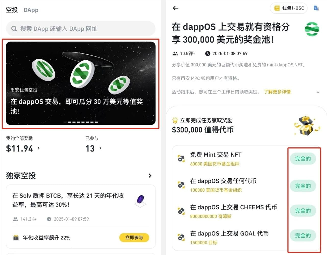 dappOS și portofelul Binance Web3 au creat o mare oportunitate - împărțirea tokenurilor de 300.000 de dolari! Sarcinile sunt simple, recompensele sunt bogate, cheia este că trebuie doar să miști degetul, iar portofelul va fi plin! Hai să vedem cum poți participa: