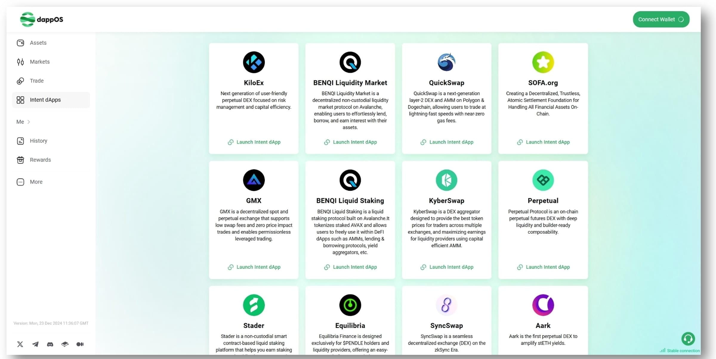 dappOS este o platformă inovatoare de tehnologie Web3, menită să îmbunătățească experiența utilizatorului pentru aplicațiile descentralizate (dApp). Aceasta transformă acțiunile utilizatorilor în intenții de sarcină printr-o rețea inteligentă de „intenții”, realizând potriviri eficiente prin noduri descentralizate, accelerând astfel tranzacțiile, reducând costurile și oferind o experiență Web3 fără întreruperi. dappOS nu doar că oferă dezvoltatorilor o infrastructură flexibilă, ci permite și utilizatorilor să se bucure de o experiență fluidă similară cu cea a schimburilor centralizate (CEX) într-un mediu descentralizat.