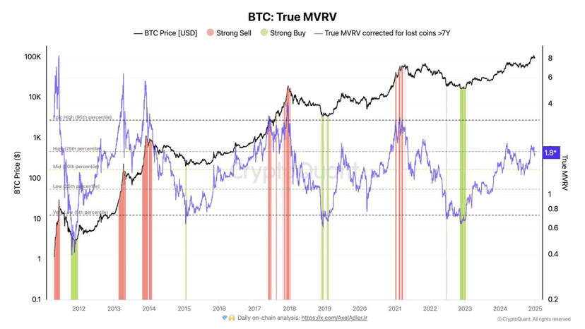 🔥 Graficul de mai sus arată că valorile actuale ale indicatorului MVRV (culoare albastră) sunt departe de zonele de vârf ale bulei (zona 6-8, și acum 1.8), așa cum a fost în ciclurile anterioare.