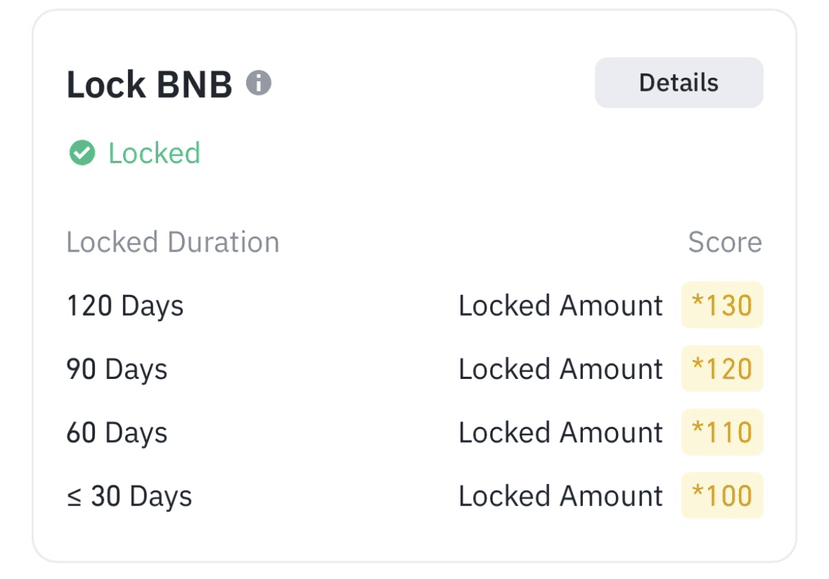 Scor BNB Blocat (bazat pe instantanee orare în timpul Perioadei de Instantanee a Produselor BNB Blocat) = (Suma medie de 120 de zile BNB Blocat x 130) + (Suma medie de 90 de zile BNB Blocat x 120) + (Suma medie de 60 de zile BNB Blocat x 110) + (Suma medie de 30 de zile BNB Blocat x 100)