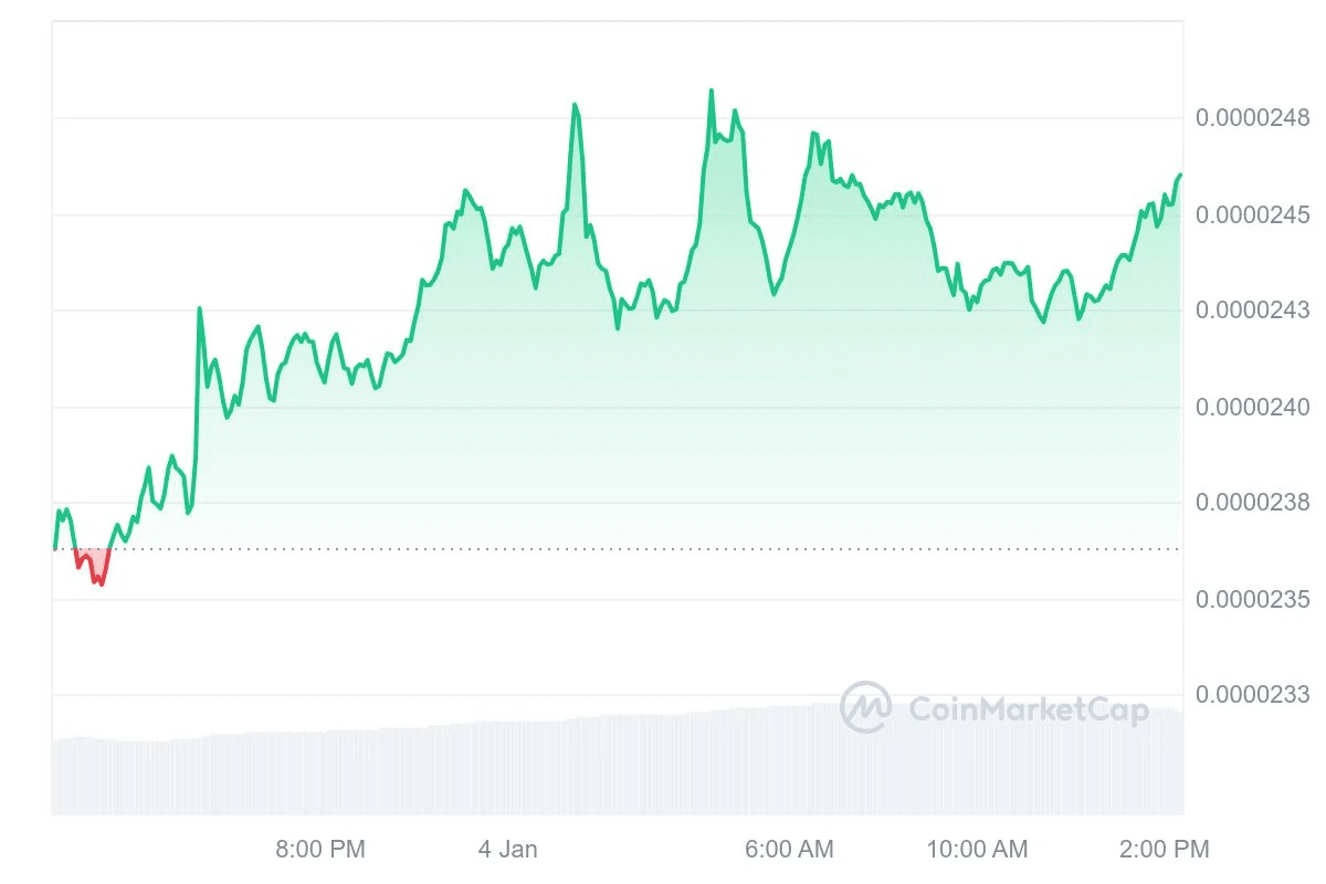 La momentul scrierii, SHIB se tranzacționează la 0,0000244 dolari, o creștere de 5,13% în ultimele 24 de ore. Volumul total de tranzacționare a crescut cu 58,06% la 761,8 milioane de dolari. Per total, prețul SHIB a menținut o gamă între un minim de 0,00002319 dolari și un maxim de 0,00002486 dolari.