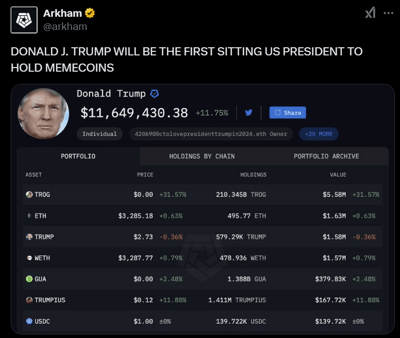 Odată un critic vocal al criptomonedelor, Donald Trump a apărut acum ca un jucător semnificativ în spațiul finanțelor digitale. Potrivit unui raport realizat de Arkham Intelligence, portofoliul crypto al lui Trump este evaluat la peste $8 milioane, cu un accent notabil pe memecoins: