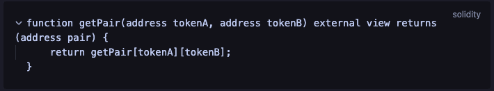 Implementarea acestei funcții se bazează pe o mapare bidimensională, care interoghează adresa perechii de tranzacționare prin combinația adreselor `tokenA` și `tokenB`. Dacă perechea de tranzacționare nu există, se returnează `0x0000000000000000000000000000000000000000`.