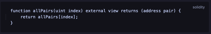 `allPairs` este un array care stochează toate adresele contractelor de perechi de tranzacționare create. Prin intermediul array-ului `allPairs`, utilizatorii pot accesa informațiile despre adresele tuturor perechilor de tranzacționare.