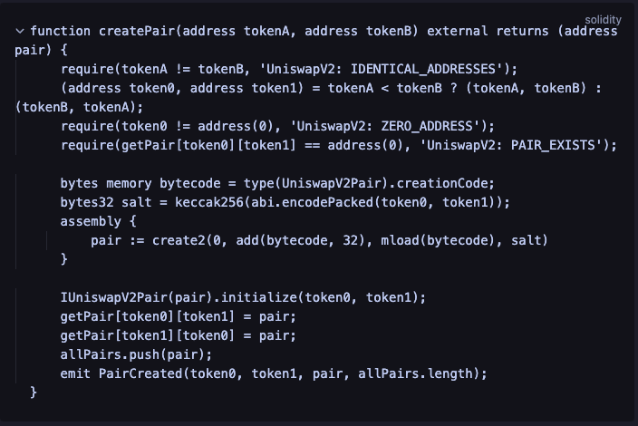 Funcția `createPair` este una dintre funcțiile de bază ale `UniswapV2Factory`, destinată creării de noi perechi de tranzacționare. Aceasta primește două adrese de tokenuri `tokenA` și `tokenB` ca intrare și returnează adresa contractului pentru perechea creată.