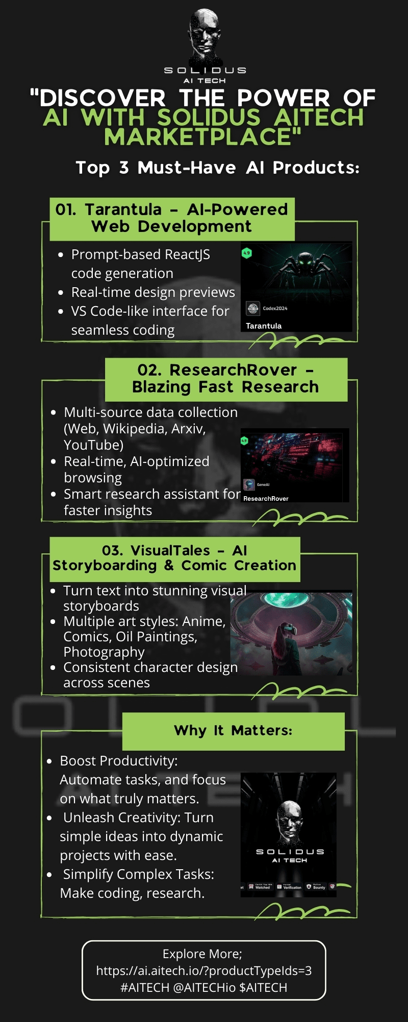 În lumea dinamică a Inteligenței Artificiale, Marketplace-ul Solidus AI TECH se remarcă ca un centru de inovație. Ca parte a provocării finale în seria de sarcini Solidus AI TECH Trifecta, am explorat colecția lor impresionantă de produse AI. După o cercetare amănunțită, am selectat primele mele trei favorite bazate pe funcționalitatea, inovația și aplicațiile lor în lumea reală. Aceste produse—Tarantula, ResearchRover și VisualTales—transformă modul în care codificăm, cercetăm și creăm. Iată de ce se remarcă.