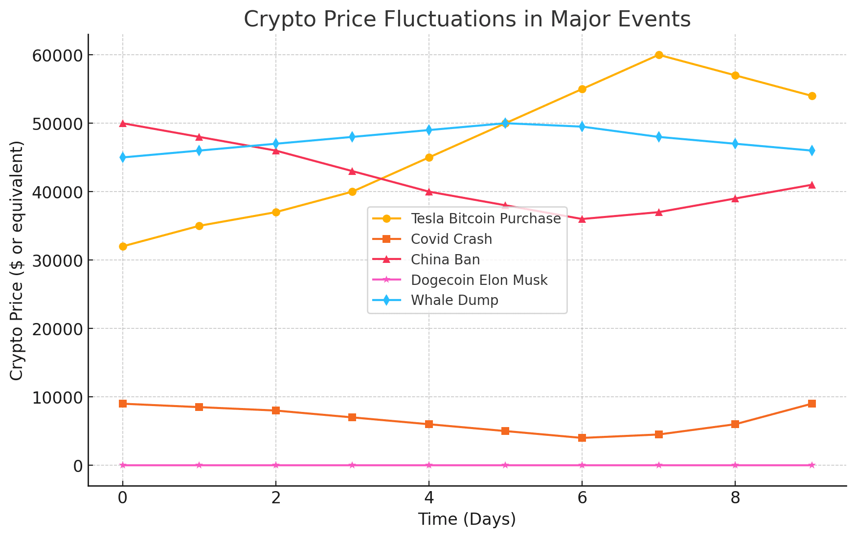 În februarie 2021, Tesla a cumpărat 1,5 miliarde de dolari în Bitcoin și a anunțat că va accepta aceasta pentru plăți. Bitcoin a sărit peste 55K $. Dar când Elon Musk a spus ulterior că Tesla renunță la plățile în Bitcoin din cauza preocupărilor legate de mediu, BTC a scăzut cu peste 30% într-o zi.