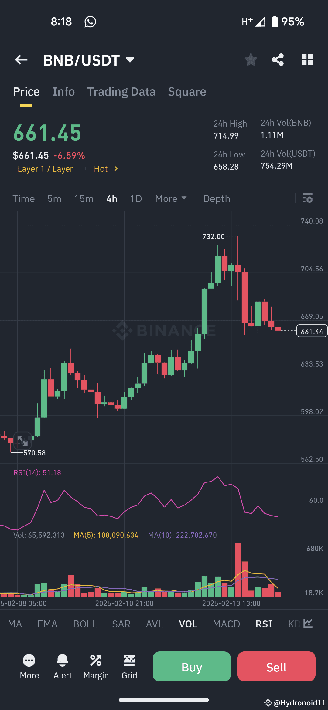 Analiza grafică: $BNB se consolidează într-un potențial steag bullish (liniile albe), sugerând o rupere iminentă. 💥 Volumul în scădere (bare roșii) susține această teorie. RSI oscillând în jurul valorii de 50 indică indecizie, dar o mișcare decisivă ar putea declanșa un trend puternic. 📈