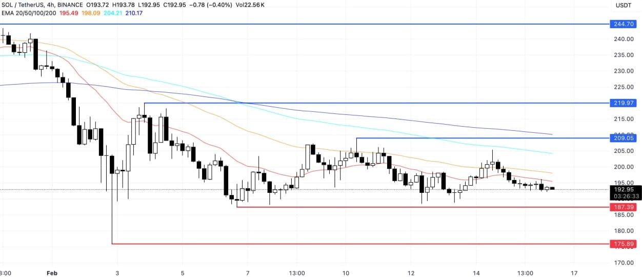 Dacă Solana continuă să scadă, cea mai apropiată zonă de suport va fi de 187 USD, iar o pauză acolo ar putea duce la o scădere la 175 USD.