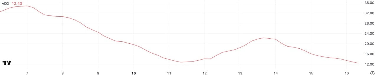 ADX a scăzut la 12,4, indicând o tendință slabă
